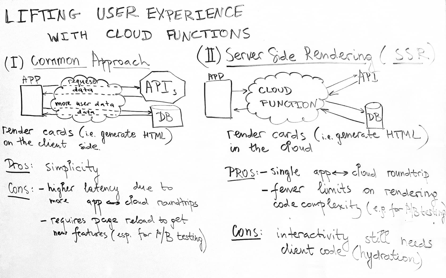 Requests from the app go to the API, where requests are processed and results sent back as response. Often, once the client processes the response more data is needed (e.g. additional user data), thus new requests are fired to the cloud (e.g. to FireStore). User interface rendering (HTML generation) can’t proceed on the client until all required data is available.